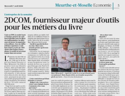 La SARL 2DCOM a été créée en juin 1998. Editeur de logiciels, nous employons plus de 40 personnes dont l’activité est dédiée au monde du livre et de l’écrit. Notre clientèle : des librairies, des diffuseurs de presse, des papeteries et des éditeurs.